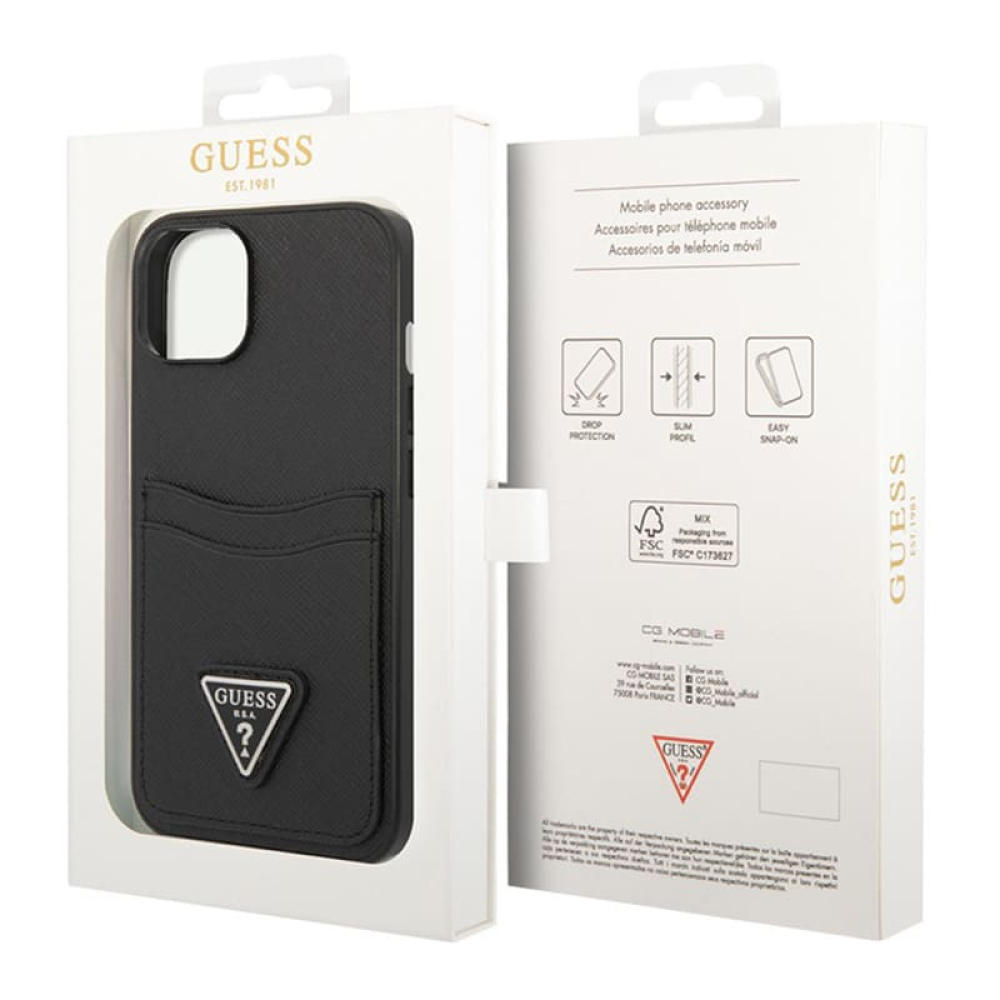 Чехол Guess для iPhone 14 Plus PU Saffiano Double cardslot Metal triangle logo Hard (GUHCP14MPSATPK) Черный - высококачественный смартфон с передовыми технологиями.
